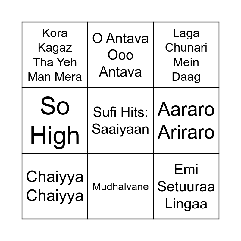 This bingo card has 52 words: Here is the complete list of 50 song titles, randomized one last time as requested:, 🎲 The Final Jumbled Song List, Butta Bomma, Tujhe Dekha Toh Yeh Jaana Sanam, Vennilave Vennilave, Pehla Nasha, O Antava Ooo Antava, Dil Le Gayi Kudi Gujarat Di, Aararo Ariraro, Ennile Chudurola, Chaiyya Chaiyya, Oru Murai Vanthu Parthaya, Pazham Thamizh Paattizhayum, Hemanthamen, Challa, Rowdy Baby, Mudhalvane, Jimikki Kammal, Anandamaaye, Sufi Hits: Saaiyaan, Brown Munde, Kaadhal Rojave, Kora Kagaz Tha Yeh Man Mera, Emi Setuuraa Lingaa, Bommali, Aakaasa Veedhilo, Naan Aanaiyittal, Devadoothar Paadi, Ezhu Sundara Rathrikal, Arabic Kuthu, Dil Deewana, So High, Kurchi Madathapetti, Sundari Kannal Oru Seithi, Chalte Chalte, Laga Chunari Mein Daag, Dhimmathirigae, Lahore, Vachinde, Manjalayil Mungi Thorthi, Mundian To Bach Ke, High Rated Gabru, Tum Hi Ho, Poo Vaasam Purappadum, Do Ghoont, Kal Ho Naa Ho, Pasoori, Thaniye Mizhikal, Thendral Vandhu Theendumbothu, Kabhi Kabhie Mere Dil Mein, Kandaangi Kandaangi and Naatu Naatu.