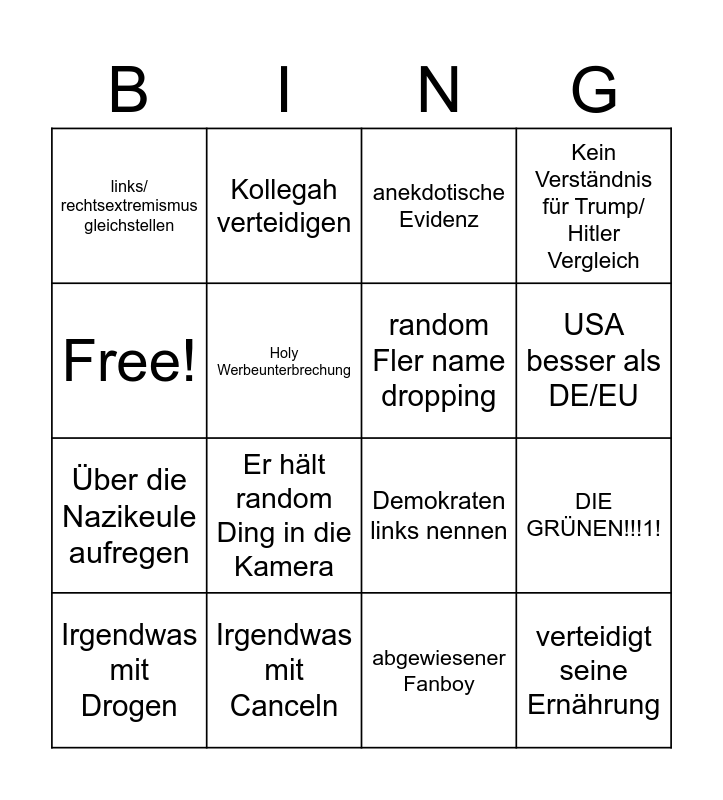 This bingo card has 16 words: Irgendwas mit Canceln, DIE GRÜNEN!!!1!, anekdotische Evidenz, links/ rechtsextremismus gleichstellen, Über die Nazikeule aufregen, Kollegah verteidigen, Demokraten links nennen, abgewiesener Fanboy, Free!, Holy Werbeunterbrechung, Irgendwas mit Drogen, Kein Verständnis für Trump/ Hitler Vergleich, Er hält random Ding in die Kamera, USA besser als DE/EU, random Fler name dropping and verteidigt seine Ernährung.