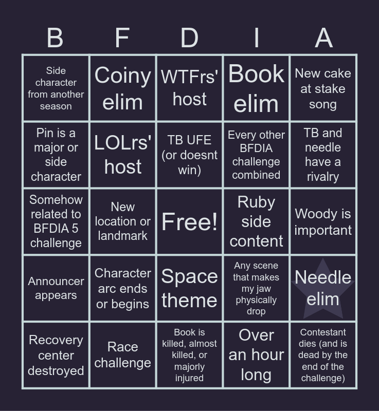 This bingo card has 1 images, a free space and 29 words: Recovery center destroyed, Alien planet mentioned, New location or landmark, Season one reference, Side character from another season, WTFrs' host, LOLrs' host, Character arc ends or begins, Ruby side content, Race challenge, Woody is important, Contestant dies (and is dead by the end of the challenge), Book is killed, almost killed, or majorly injured, Over an hour long, TB and needle have a rivalry, Pre merge teams mentioned, Space theme, Announcer appears, New cake at stake song, Somehow related to BFDIA 5 challenge, Any scene that makes my jaw physically drop, New merch, Every other BFDIA challenge combined, Pin is a major or side character, Book elim, Coiny elim, Needle elim, TB UFE (or doesnt win) and No winner.