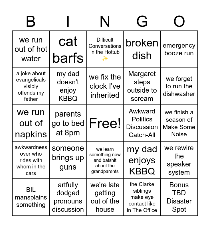 This bingo card has a free space and 24 words: someone brings up guns, artfully dodged pronouns discussion, we fix the clock I've inherited, BIL mansplains something, emergency booze run, we run out of hot water, a joke about evangelicals visibly offends my father, cat barfs, Awkward Politics Discussion Catch-All, we learn something new and batshit about the grandparents, Margaret steps outside to scream, we run out of napkins, my dad enjoys KBBQ, we rewire the speaker system, my dad doesn't enjoy KBBQ, the Clarke siblings make eye contact like in The Office, we finish a season of Make Some Noise, Difficult Conversations in the Hottub ✨, we forget to run the dishwasher, parents go to bed at 8pm, Bonus TBD Disaster Spot, awkwardness over who rides with whom in the cars, broken dish and we're late getting out of the house.