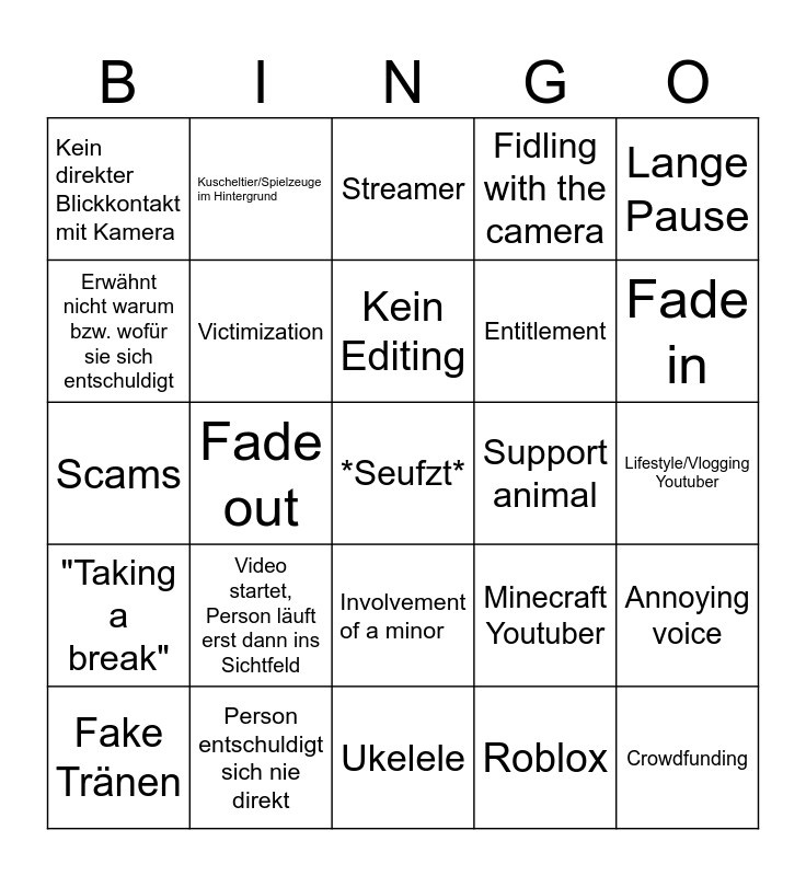 This bingo card has a free space and 24 words: Video startet, Person läuft erst dann ins Sichtfeld, Person entschuldigt sich nie direkt, Kein Editing, Fake Tränen, Lange Pause, Kein direkter Blickkontakt mit Kamera, Erwähnt nicht warum bzw. wofür sie sich entschuldigt, Kuscheltier/Spielzeuge im Hintergrund, Support animal, Involvement of a minor, Entitlement, Scams, Minecraft Youtuber, Annoying voice, Victimization, Roblox, Lifestyle/Vlogging Youtuber, Streamer, Fade in, Fade out, Crowdfunding, "Taking a break", Fidling with the camera and Ukelele.