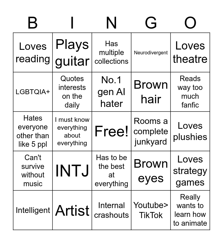 This bingo card has a free space and 24 words: INTJ, Artist, No.1 gen AI hater, Intelligent, Loves theatre, Loves reading, LGBTQIA+, Plays guitar, Rooms a complete junkyard, Has to be the best at everything, Brown hair, Hates everyone other than like 5 ppl, Brown eyes, Loves strategy games, Quotes interests on the daily, Youtube> TikTok, Loves plushies, Has multiple collections, Reads way too much fanfic, I must know everything about everything, Really wants to learn how to animate, Can't survive without music, Neurodivergent and Internal crashouts.