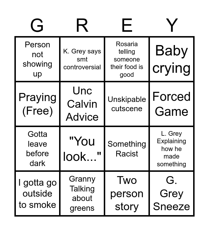 This bingo card has 16 words: Granny Talking about greens, L. Grey Explaining how he made something, Rosaria telling someone their food is good, Person not showing up, Gotta leave before dark, K. Grey says smt controversial, Something Racist, Two person story, Praying (Free), Unc Calvin Advice, I gotta go outside to smoke, Baby crying, "You look...", Forced Game, Unskipable cutscene and G. Grey Sneeze.