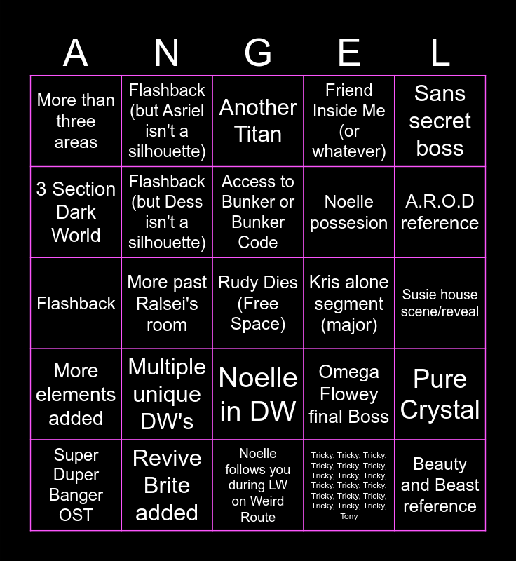 This bingo card has a free space and 75 words: Asgore gains + Aura, Festival is interrupted (by non-DW), Another Titan, Knight reveal/ major hint, Egg route is complicated, Flowey based NPC, Omega Flowey secret boss, Gaster call, (like at the end of ch4), Knight phone call, Beach section, Toriel confronts Asgore (or vice versa), Purple soul mode, Access to Bunker or Bunker Code, 3 Section Dark World, Angel lore drop, More past Ralsei's room, "Kill or Be Killed", Beauty and Beast reference, Friend Appears again, Sans secret boss, Shears based mini-boss, Flashback, Flashback (but Dess isn't a silhouette), Flashback (but Asriel isn't a silhouette), Friend Inside Me (or whatever), Asgore Weird Route boss fight, More Lightners in DW (excluding Asgore), Asriel Reveal, Cat Mike is Friend, CT Rudinn is Seventh Flying Ace (or goner), Tenna did something really bad, Rudy Lives!!, Clopen persists, Omega Flowey final Boss, A.R.O.D reference, Noelle possesion, Vessel reference, 2nd Knight fight, Susie house scene/reveal, Tricky, Tricky, Tricky, Tricky, Tricky, Tricky, Tricky, Tricky, Tricky, Tricky, Tricky, Tricky, Tricky, Tricky, Tricky, Tricky, Tricky, Tricky, Tony, Jevil content babiiiii, Asgore is fukcing dies omg (neutral/pacifist), Doomed Yoai (BP flips out and loses it once he learns Nice Cream Guy is on the other end), Knight is fukcing dies omg (weird route), Huge cliffhanger, Susie asks about you (the soul), Super Duper Banger OST, More than three areas, Blue Soul mode, Orange/Blue attacks, Seam Does Something Challenge *impossible*, Noelle in DW, Orange/Cyan soul mode, we see the other side of town, Flower shop but like an actual shop, Last prophecy panel revealed, Nintendo Switch soul mode, Watering Can Mini-boss, sans dw design not change, Kris focused chapter, Multiple unique DW's, UT recreation / retelling, Climb mechanic brought back, Noelle rejoins the party, Noelle interacts with Ralsei, Kris alone segment (major), Take over Ralsei (normal route), Another Independent soul segment, Something genuinely terrifiying, Pure Crystal, More elements added, Revive Brite added, New item fusions (Malius), Noelle follows you during LW on Weird Route and Castle Town Outskirts Exploration.