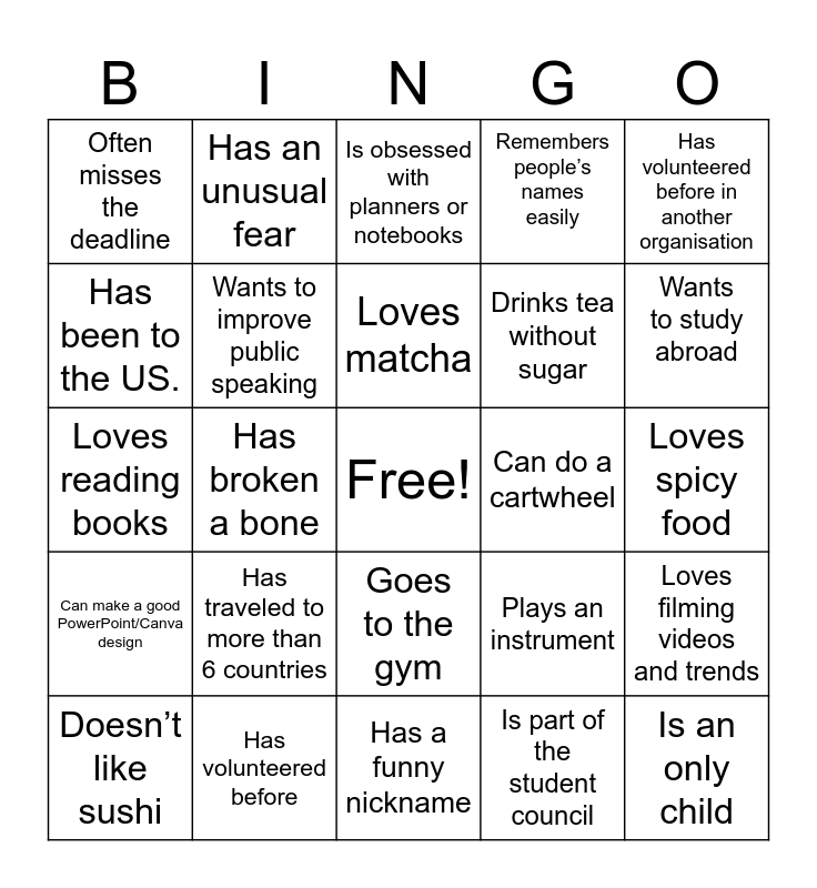 This bingo card has a free space and 24 words: Has traveled to more than 6 countries, Has volunteered before, Loves matcha, Doesn’t like sushi, Has volunteered before in another organisation, Often misses the deadline, Has been to the US., Has an unusual fear, Can do a cartwheel, Goes to the gym, Drinks tea without sugar, Loves reading books, Plays an instrument, Loves filming videos and trends, Wants to improve public speaking, Is part of the student council, Loves spicy food, Is obsessed with planners or notebooks, Wants to study abroad, Has broken a bone, Is an only child, Can make a good PowerPoint/Canva design, Remembers people’s names easily and Has a funny nickname.