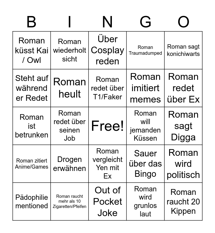 This bingo card has a free space and 24 words: Drogen erwähnen, Roman raucht mehr als 10 Zigaretten/Pfeifen, Roman redet über T1/Faker, Pädophilie mentioned, Roman sagt konichiwarts, Roman küsst Kai / Owl, Steht auf während er Redet, Roman wiederholt sicht, Roman will jemanden Küssen, Roman vergleicht Yen mit Ex, Roman imitiert memes, Roman ist betrunken, Sauer über das Bingo, Roman wird politisch, Roman heult, Roman wird grunlos laut, Roman sagt Digga, Über Cosplay reden, Roman redet über Ex, Roman redet über seinen Job, Roman raucht 20 Kippen, Roman zitiert Anime/Games, Roman Traumadumped and Out of Pocket Joke.