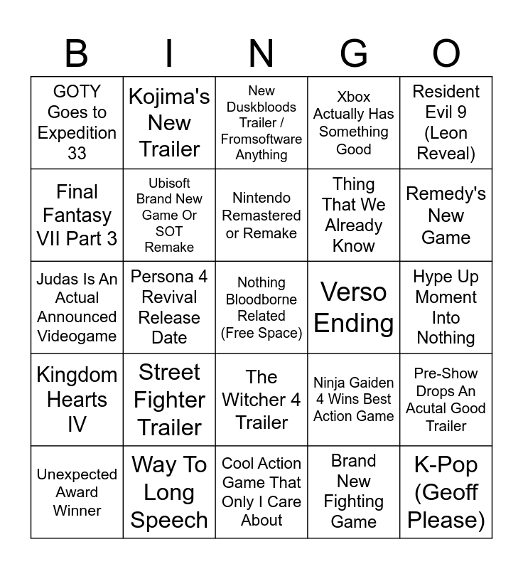 This bingo card has a free space and 24 words: Street Fighter Trailer, Way To Long Speech, Nintendo Remastered or Remake, Unexpected Award Winner, Resident Evil 9 (Leon Reveal), GOTY Goes to Expedition 33, Final Fantasy VII Part 3, Kojima's New Trailer, Verso Ending, The Witcher 4 Trailer, Thing That We Already Know, Judas Is An Actual Announced Videogame, Ninja Gaiden 4 Wins Best Action Game, Pre-Show Drops An Acutal Good Trailer, Ubisoft Brand New Game Or SOT Remake, Brand New Fighting Game, Hype Up Moment Into Nothing, New Duskbloods Trailer / Fromsoftware Anything, Remedy's New Game, Persona 4 Revival Release Date, K-Pop (Geoff Please), Kingdom Hearts IV, Xbox Actually Has Something Good and Cool Action Game That Only I Care About.