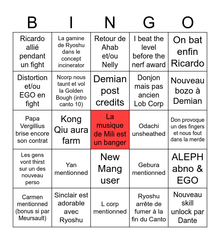 This bingo card has a free space and 24 words: Yan mentionned, Sinclair est adorable avec Ryoshu, Demian post credits, Carmen mentionned (bonus si par Meursault), On bat enfin Ricardo, Ricardo allié pendant un fight, Distortion et/ou EGO en fight, La gamine de Ryoshu dans le concept incinerator, Odachi unsheathed, New Mang user, Donjon mais pas ancien Lob Corp, Papa Vergillius brise encore son contrat, Gebura mentionned, ALEPH abno & EGO, Ncorp nous taunt et vol la Golden Bough (intro canto 10), Ryoshu arrête de fumer à la fin du Canto, Don provoque un des fingers et nous fout dans la merde, Retour de Ahab et/ou Nelly, Nouveau bozo à Demian, Kong Qiu aura farm, Nouveau skill unlock par Dante, Les gens vont thirst sur un des nouveau perso, I beat the level before the nerf award and L corp mentionned.
