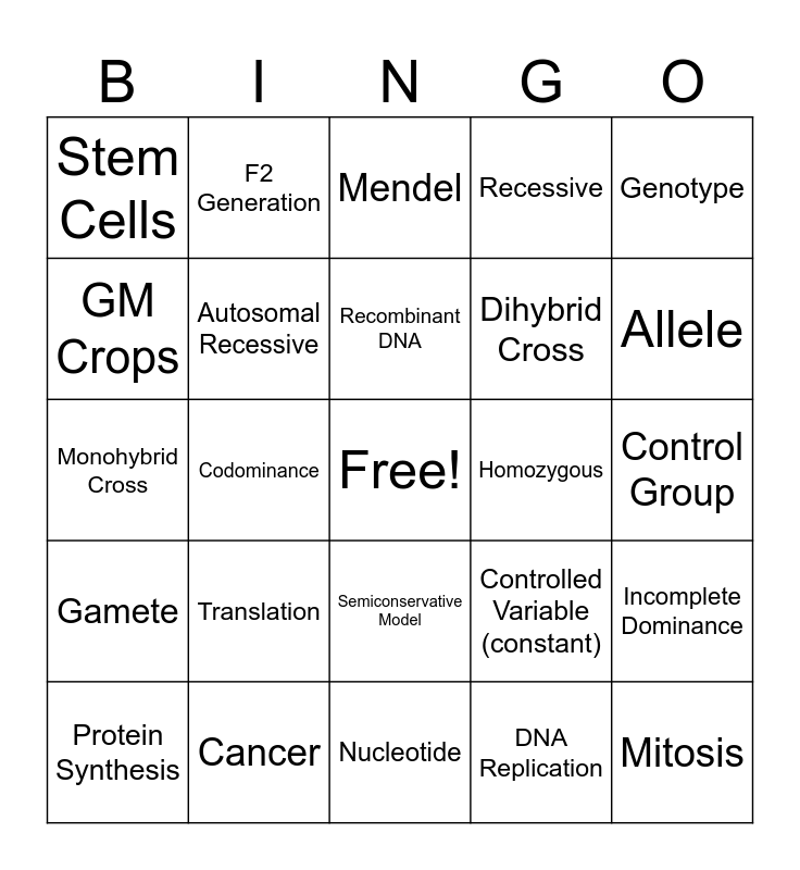 This bingo card has a free space and 43 words: Synthesize, Mitosis, Transcription, Protein Synthesis, Cloning, DNA Replication, Mendel, Autosomal Dominant, Genotype, Cancer, Recessive, Homozygous, Semiconservative Model, Translation, XY, Nucleotide, S-Phase of Interphase, Monohybrid Cross, F1 Generation, Allele, F2 Generation, Amino Acid, Independent Variable, Stem Cells, XX, Control Group, X-Linked, Dependent Variable, Controlled Variable (constant), Gamete, Phenotype, Incomplete Dominance, Meiosis, Codominance, Ethics, Gel Electrophoresis, Somatic, Recombinant DNA, GM Crops, Dihybrid Cross, Heterozygous, Autosomal Recessive and Dominant.