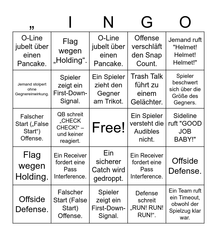 This bingo card has a free space and 54 words: Ref, was pfeifst du da?!, Flag wegen Holding., Ein Spieler ruft "LET'S GO!", QB wirft den Ball ins Aus., Ein sicherer Catch wird gedroppt., Defense schreit "RUN! RUN! RUN!", Offense verschläft den Snap Count., Ein Spieler verliert seinen Mundschutz., Jemand stolpert ohne Gegnereinwirkung., Ein Coach wirft mit der Mütze., O-Line jubelt über einen Pancake., RB rennt direkt in seine O-Line., Falscher Start (False Start) Offense., Offside Defense., QB scramblet, obwohl ein Receiver frei wäre., Spieler zeigt ein First-Down-Signal., Ein Team ruft ein Timeout, obwohl der Spielzug klar war., Trash Talk führt zu einem Gelächter., Ein Spieler schreit "MEIN BALL!", Sideline ruft "GOOD JOB BABY!", Ein Receiver fordert eine Pass Interference., Ein Kicker verzieht ein einfaches Field Goal., Ein Spieler versteht die Audibles nicht., Jemand ruft "Helmet! Helmet! Helmet!", „Ref, was pfeifst du da?!“, Flag wegen „Holding“., Ein Spieler ruft „LET’S GO!“., QB wirft den Ball ins Aus., Ein sicherer Catch wird gedroppt., Defense schreit „RUN! RUN! RUN!“., Offense verschläft den Snap Count., Ein Spieler verliert seinen Mundschutz., Jemand stolpert ohne Gegnereinwirkung., Ein Coach wirft mit der Mütze., O-Line jubelt über einen Pancake., RB rennt direkt in seine O-Line., Falscher Start („False Start“) Offense., Offside Defense., QB scramblet, obwohl ein Receiver völlig frei wäre., Spieler zeigt ein First-Down-Signal., Ein Team ruft ein Timeout, obwohl der Spielzug klar war., Trash Talk führt zu einem Gelächter., Ein Spieler schreit „MEIN BALL!“., Sideline ruft „GOOD JOB BABY!“., Ein Receiver fordert eine Pass Interference., Ein Kicker verzieht ein einfaches Field Goal., Ein Spieler versteht die Audibles nicht., Jemand ruft „Helmet! Helmet! Helmet!“., Ein Spieler zieht den Gegner am Trikot., QB schreit „CHECK CHECK!“ – und keiner reagiert., Spieler beschwert sich über die Größe des Gegners., Ein Rookie fragt: „Welches Play war das nochmal?“., Sideline jubelt lauter als das Feld. and Ein Coach sagt: „Bleib einfach bei deiner Assignments!“..