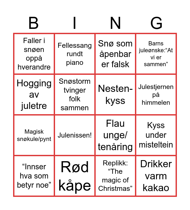 This bingo card has 1 images and 32 words: Det snør!, Kyss under misteltein, Noen lager snømann, Drikker varm kakao, Nesten-kyss, Hogging av juletre, Et julemirakel, Fellessang rundt piano, En slem blir snill, Julestjernen på himmelen, Snø som åpenbar er falsk, Starter med fly-filming av by, Valper, Rød kåpe, Julenissen!, Fiender blir venner, Flau unge/ tenåring, Baking av pepperkaker, Snøklump i hodet, “Vi har nettopp møttes”-kjærlighet, Karriere droppes for kjærlighet, Faller i snøen oppå hverandre, Replikk: “The magic of Christmas”, Overkoselig nabolag, “Innser hva som betyr noe”, Barns juleønske:“At vi er sammen”, Magisk snøkule/pynt, Snøstorm tvinger folk sammen, Julhater som mykner, Julemarked + varm drikke, Julemontasje med musikk and Julebakst som mislykkes.