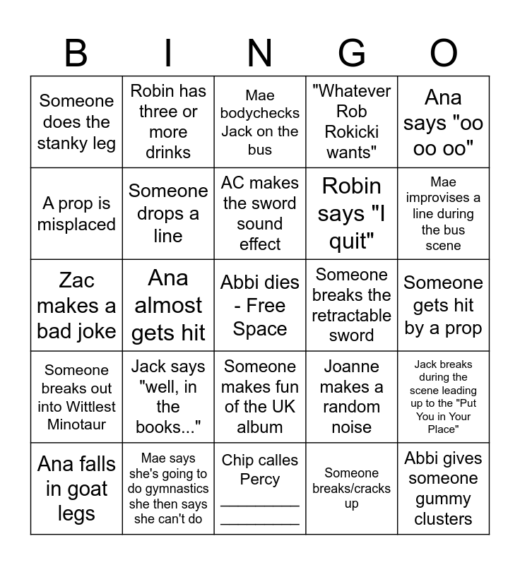 This bingo card has a free space and 24 words: Jack says "well, in the books...", Mae says she's going to do gymnastics she then says she can't do, AC makes the sword sound effect, Ana falls in goat legs, Ana says "oo oo oo", Someone does the stanky leg, A prop is misplaced, Robin has three or more drinks, Someone breaks the retractable sword, Someone makes fun of the UK album, Robin says "I quit", Zac makes a bad joke, Joanne makes a random noise, Jack breaks during the scene leading up to the "Put You in Your Place", Someone drops a line, Someone breaks/cracks up, Someone gets hit by a prop, Mae bodychecks Jack on the bus, Mae improvises a line during the bus scene, Ana almost gets hit, Abbi gives someone gummy clusters, Someone breaks out into Wittlest Minotaur, "Whatever Rob Rokicki wants" and Chip calles Percy _________ _________.