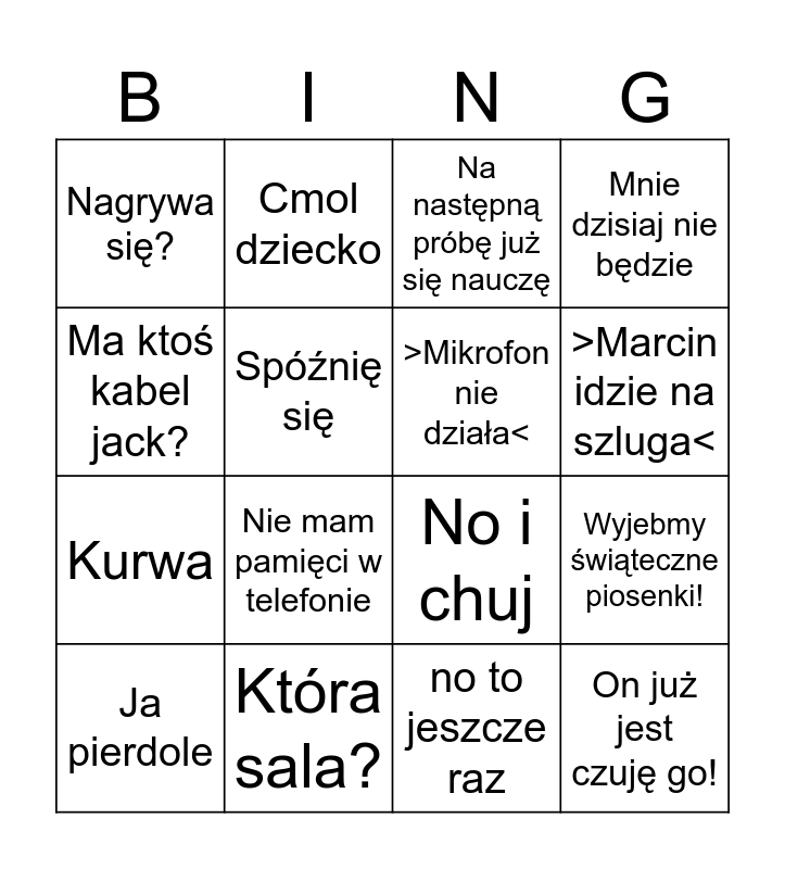 This bingo card has 16 words: Która sala?, Wyjebmy świąteczne piosenki!, Na następną próbę już się nauczę, Nagrywa się?, Kurwa, Cmol dziecko, No i chuj, no to jeszcze raz, Ma ktoś kabel jack?, Spóźnię się, Ja pierdole, Mnie dzisiaj nie będzie, Nie mam pamięci w telefonie, >Marcin idzie na szluga<, >Mikrofon nie działa< and On już jest czuję go!.