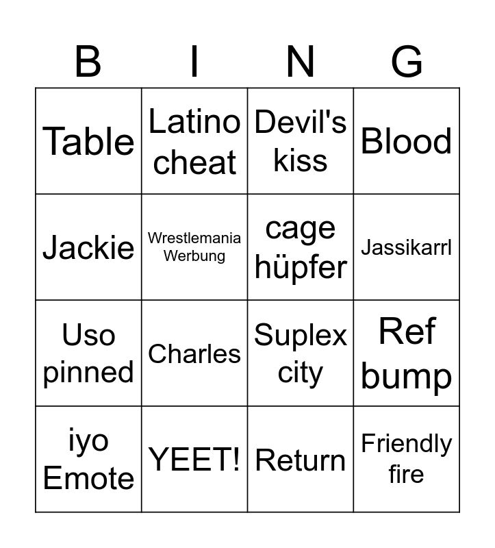 This bingo card has 16 words: YEET!, Ref bump, Devil's kiss, Table, Uso pinned, Latino cheat, Suplex city, Return, Jackie, Wrestlemania Werbung, iyo Emote, Blood, Charles, Jassikarrl, cage hüpfer and Friendly fire.