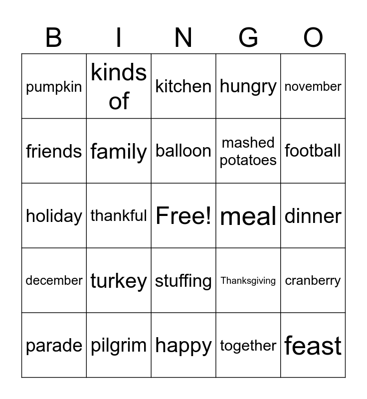 This bingo card has a free space and 24 words: turkey, pilgrim, balloon, parade, november, pumpkin, friends, kinds of, meal, stuffing, mashed potatoes, holiday, Thanksgiving, cranberry, family, together, dinner, kitchen, football, thankful, feast, december, hungry and happy.