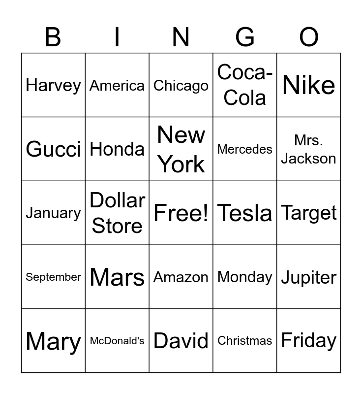 This bingo card has a free space and 44 words: April, Friday, Mr. Johnson, Mary, Walmart, Christmas, Chicago, Pulaski, Nike, McDonald's, Coca-Cola, Tesla, Amazon, Mars, Brookfield Zoo, David, Beyonce, January, Main Street, Mrs. Jackson, America, Alaska, Parks Elementary, Harvey, Helen, Target, Oakville Market, Grand Canyon, Monday, September, Easter, Jupiter, Adidas, Aldi, Dollar Store, Coach Purse, Sony, Samsung, New York, Gucci, Mercedes, Cadillac, Honda and Toyota.