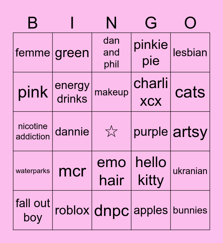 This bingo card has a free space and 24 words: mcr, roblox, makeup, fall out boy, lesbian, femme, pink, green, purple, emo hair, charli xcx, nicotine addiction, hello kitty, ukranian, energy drinks, apples, artsy, dan and phil, cats, dannie, bunnies, waterparks, pinkie pie and dnpc.