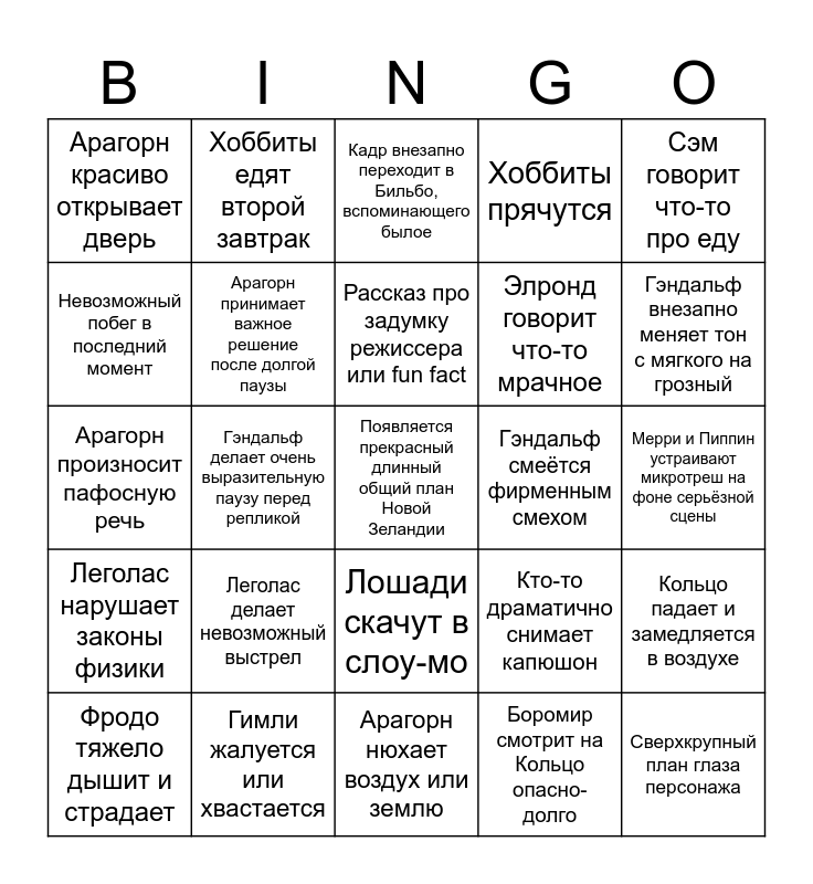 This bingo card has a free space and 24 words: Леголас делает невозможный выстрел, Гимли жалуется или хвастается, Рассказ про задумку режиссера или fun fact, Фродо тяжело дышит и страдает, Сэм говорит что-то про еду, Арагорн красиво открывает дверь, Невозможный побег в последний момент, Хоббиты едят второй завтрак, Гэндальф смеётся фирменным смехом, Лошади скачут в слоу-мо, Элронд говорит что-то мрачное, Арагорн произносит пафосную речь, Кто-то драматично снимает капюшон, Кольцо падает и замедляется в воздухе, Арагорн принимает важное решение после долгой паузы, Боромир смотрит на Кольцо опасно-долго, Мерри и Пиппин устраивают микротреш на фоне серьёзной сцены, Кадр внезапно переходит в Бильбо, вспоминающего былое, Гэндальф внезапно меняет тон с мягкого на грозный, Гэндальф делает очень выразительную паузу перед репликой, Сверхкрупный план глаза персонажа, Леголас нарушает законы физики, Хоббиты прячутся and Арагорн нюхает воздух или землю.