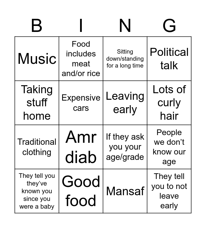 This bingo card has 16 words: Good food, People we don’t know our age, Sitting down/standing for a long time, Music, Traditional clothing, Food includes meat and/or rice, If they ask you your age/grade, Mansaf, Taking stuff home, Expensive cars, They tell you they’ve known you since you were a baby, Political talk, Amr diab, Lots of curly hair, Leaving early and They tell you to not leave early.