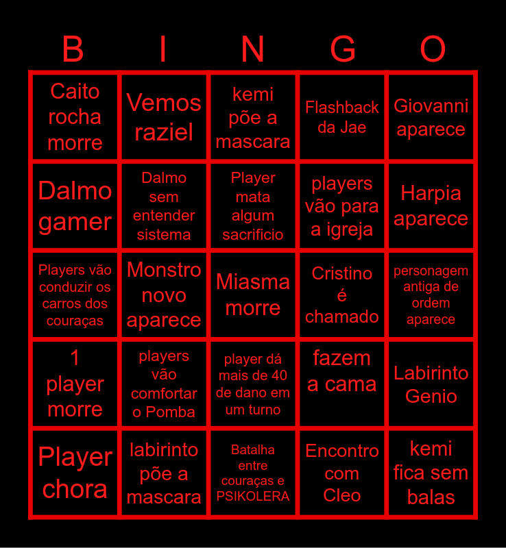 This bingo card has 25 words: 1 player morre, labirinto põe a mascara, Miasma morre, Encontro com Cleo, Giovanni aparece, Caito rocha morre, Vemos raziel, kemi põe a mascara, Cristino é chamado, Labirinto Genio, Dalmo gamer, Dalmo sem entender sistema, Batalha entre couraças e PSIKOLERA, fazem a cama, Harpia aparece, Player chora, Monstro novo aparece, Player mata algum sacrificio, players vão para a igreja, personagem antiga de ordem aparece, Players vão conduzir os carros dos couraças, players vão comfortar o Pomba, player dá mais de 40 de dano em um turno, Flashback da Jae and kemi fica sem balas.