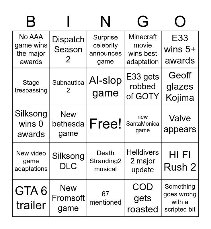 This bingo card has a free space and 24 words: Silksong DLC, New Fromsoft game, AI-slop game, GTA 6 trailer, E33 wins 5+ awards, No AAA game wins the major awards, Stage trespassing, Dispatch Season 2, new SantaMonica game, Death Stranding2 musical, E33 gets robbed of GOTY, Silksong wins 0 awards, Helldivers 2 major update, HI FI Rush 2, Subnautica 2, COD gets roasted, Valve appears, Surprise celebrity announces game, Geoff glazes Kojima, New bethesda game, Something goes wrong with a scripted bit, New video game adaptations, Minecraft movie wins best adaptation and 67 mentioned.
