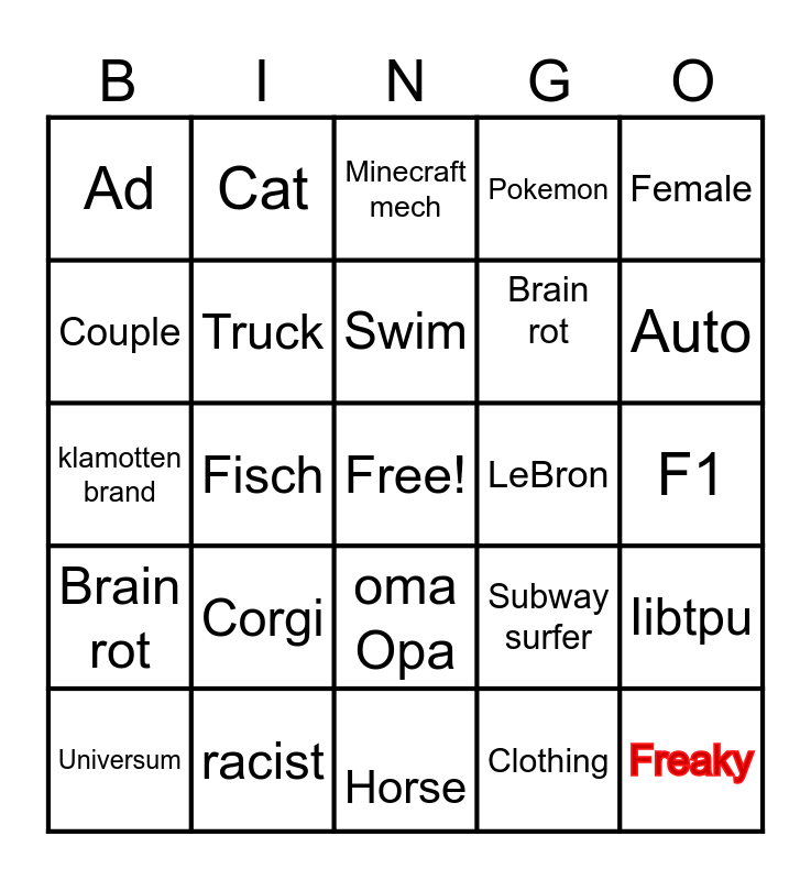 This bingo card has a free space and 49 words: Food, Freaky, Goat, Horse, Corgi, Otter, Cat, Cringe, Couple, Military, Truck, Pokemon, Iibtpu, Subway surfer, Hopeless core, School, Swim, LeBron, Minecraft parkou, Female, Fisch, Clothing, Ad, Brain rot, Katze, Auto, Universum, verdammt Peinlich, oma Opa, Brain rot, goon, ski, snowboard, Nürburgrin, racist, Bastighg, Lattenarsch, Luna, F1, altes meme, i run, bmw, unstable edit, food, klamotten brand, Minecraft mech, tote werbung, craft attack and filow.