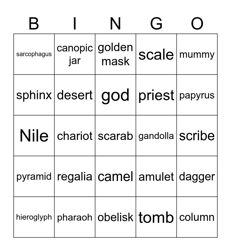This bingo card has 25 words: pyramid, pharaoh, scarab, tomb, mummy, sarcophagus, canopic jar, golden mask, gandolla, dagger, sphinx, desert, obelisk, amulet, papyrus, hieroglyph, chariot, god, priest, scribe, Nile, regalia, camel, scale and column.