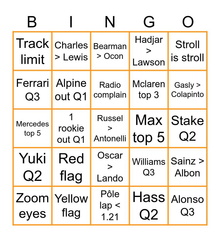 This bingo card has a free space and 24 words: Red flag, Yellow flag, Radio complain, Zoom eyes, Stroll is stroll, Track limit, Ferrari Q3, Charles > Lewis, Max top 5, Oscar > Lando, Mclaren top 3, Mercedes top 5, Williams Q3, Sainz > Albon, Alpine out Q1, Hass Q2, Stake Q2, Bearman > Ocon, Gasly > Colapinto, 1 rookie out Q1, Alonso Q3, Yuki Q2, Hadjar > Lawson and Pôle lap < 1.21.