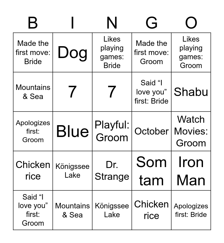 ⚠ This card has duplicate items: Made the first move: Groom (2), Playful: Groom (2), Oktoberfest (2), Said “I love you” first: Groom (2), Shabu (2), Apologizes first: Groom (2), Dog (2), Green (2), 7 (2), Phone: Bride (2), Dr. Strange (2), Spiderman (2), Watch Movies: Groom (2), Likes playing games: Groom (2), October (2), Mountains & Sea (2), Blue (2), Made the first move: Bride (2), Playful: Bride (2), Königssee Lake (2), Said “I love you” first: Bride (2), Som tam (2), Chicken rice (2), Apologizes first: Bride (2), Cat (2), Brown (2), 5 (2), Phone: Groom (2), Iron Man (2), Hulk (2), Likes playing games: Bride (2), August (2), Mountain (2), Sea (2)
