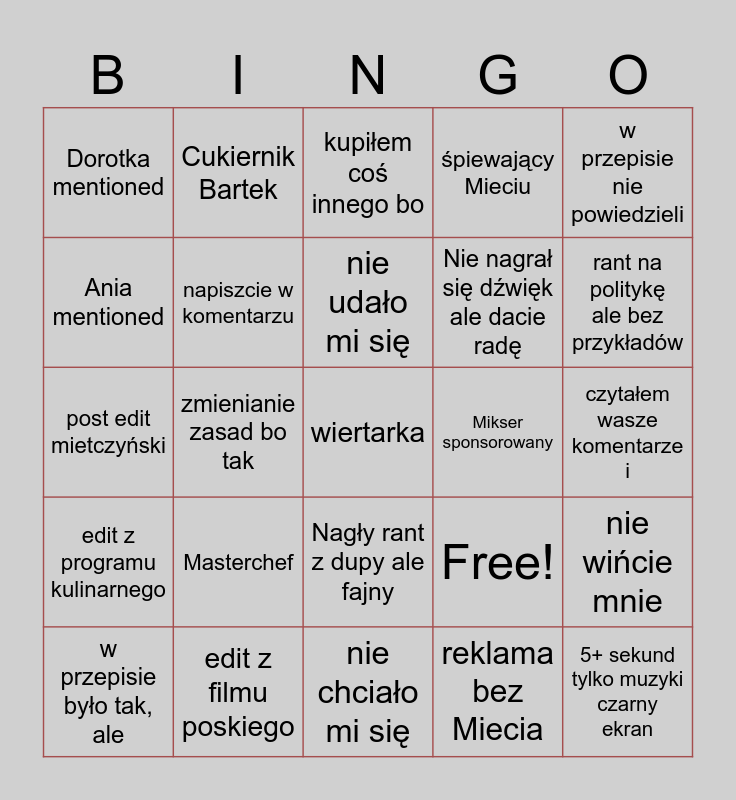 This bingo card has 25 words: Masterchef, nie chciało mi się, nie udało mi się, w przepisie było tak, ale, w przepisie nie powiedzieli, Dorotka mentioned, Ania mentioned, Cukiernik Bartek, Mikser sponsorowany, Nagły rant z dupy ale fajny, Nie nagrał się dźwięk ale dacie radę, post edit mietczyński, Free!, nie wińcie mnie, napiszcie w komentarzu, 5+ sekund tylko muzyki czarny ekran, czytałem wasze komentarze i, kupiłem coś innego bo, rant na politykę ale bez przykładów, zmienianie zasad bo tak, wiertarka, edit z filmu poskiego, edit z programu kulinarnego, śpiewający Mieciu and reklama bez Miecia.