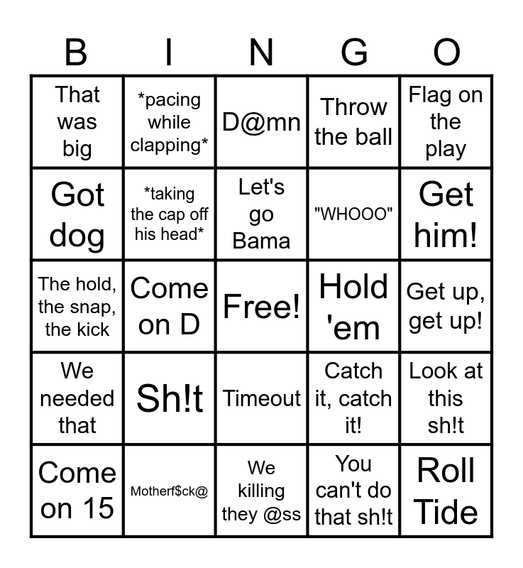 This bingo card has a free space and 24 words: Sh!t, Motherf$ck@, Let's go Bama, Come on 15, Flag on the play, That was big, Got dog, *pacing while clapping*, Hold 'em, Timeout, "WHOOO", The hold, the snap, the kick, Catch it, catch it!, Look at this sh!t, *taking the cap off his head*, You can't do that sh!t, Get up, get up!, D@mn, Get him!, Come on D, Roll Tide, We needed that, Throw the ball and We killing they @ss.