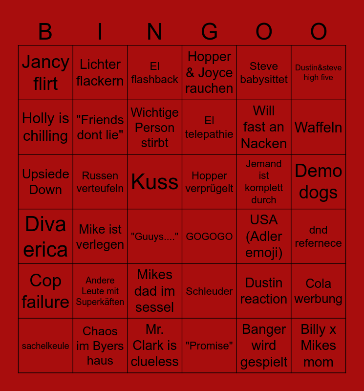 This bingo card has 36 words: Schleuder, Mikes dad im sessel, "Promise", Holly is chilling, Diva erica, Hopper verprügelt, "Friends dont lie", Mr. Clark is clueless, Steve babysittet, Dustin reaction, Waffeln, Hopper & Joyce rauchen, Cola werbung, Russen verteufeln, El telepathie, Jancy flirt, Cop failure, Jemand ist komplett durch, Upsiede Down, El flashback, Kuss, Mike ist verlegen, GOGOGO, "Guuys....", USA (Adler emoji), Lichter flackern, Will fast an Nacken, Chaos im Byers haus, Wichtige Person stirbt, Dustin&steve high five, Billy x Mikes mom, sachelkeule, dnd refernece, Demo dogs, Andere Leute mit Superkäften and Banger wird gespielt.
