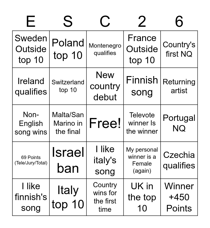 This bingo card has a free space and 24 words: Israel ban, Italy top 10, New country debut, I like finnish's song, Country's first NQ, Sweden Outside top 10, Ireland qualifies, Poland top 10, Televote winner Is the winner, I like italy's song, Finnish song, Non-English song wins, My personal winner is a Female (again), Czechia qualifies, Switzerland top 10, UK in the top 10, Portugal NQ, Montenegro qualifies, Returning artist, Malta/San Marino in the final, Winner +450 Points, 69 Points (Tele/Jury/Total), France Outside top 10 and Country wins for the first time.