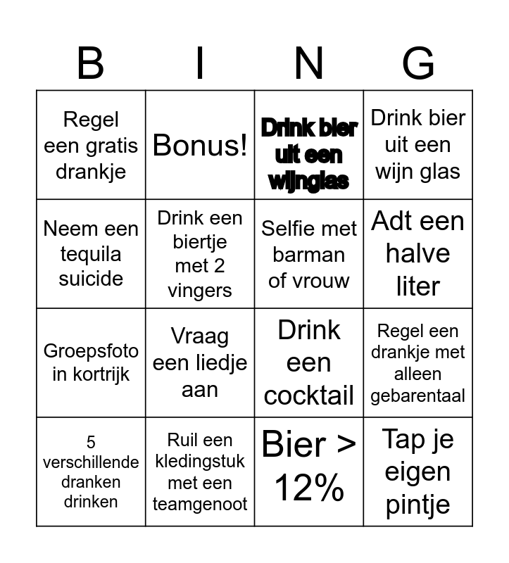 This bingo card has 19 words: Drink een cocktail, Verzamel bierviltjes van 10 verschillende merken, Drink bier uit een wijnglas, Tap je eigen pintje, Regel een drankje met alleen gebarentaal, Neem een tequila suicide, Bier > 12%, Regel een gratis drankje, Bonus!, Groepsfoto in kortrijk, Vraag een liedje aan, Drink een biertje met 2 vingers, Selfie met barman of vrouw, Ruil een kledingstuk met een teamgenoot, 5 verschillende dranken drinken, Neem een shotje met een willekeurig onbekend persoon, Drink bier uit een wijn glas, Adt een halve liter and Neem een drankje met het hele team.