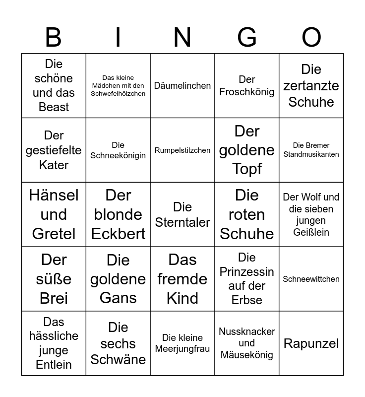 This bingo card has 31 words: Die kleine Meerjungfrau, Aschenputtel, Der blonde Eckbert, Rotkäppchen, Die schöne und das Beast, Däumelinchen, Die Schneekönigin, Die Prinzessin auf der Erbse, Die roten Schuhe, Nussknacker und Mäusekönig, Der Wolf und die sieben jungen Geißlein, Die Sterntaler, Rapunzel, Frau Holle, Die Bremer Standmusikanten, Dornröschen, Schneewittchen, Die goldene Gans, Der süße Brei, Das fremde Kind, Die zertanzte Schuhe, Der Hase und der Igel, Das hässliche junge Entlein, Das kleine Mädchen mit den Schwefelhölzchen, Der goldene Topf, Der gestiefelte Kater, Der Froschkönig, Hänsel und Gretel, Die sechs Schwäne, Rumpelstilzchen and Der goldene Vogel.