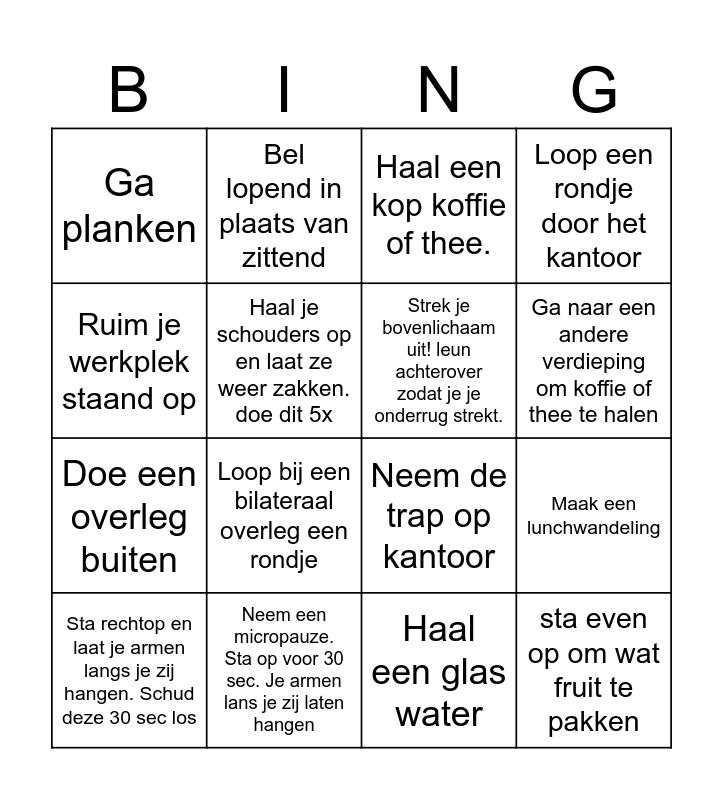 This bingo card has 17 words: Haal een glas water, Sta rechtop en laat je armen langs je zij hangen. Schud deze 30 sec los, Haal een kop koffie of thee., Ga planken, Loop bij een bilateraal overleg een rondje, Loop een rondje door het kantoor, Maak een lunchwandeling, Strek je bovenlichaam uit! leun achterover zodat je je onderrug strekt., Ga naar een andere verdieping om koffie of thee te halen, Haal je schouders op en laat ze weer zakken. doe dit 5x, Neem een micropauze. Sta op voor 30 sec. Je armen lans je zij laten hangen, Neem de trap op kantoor, Ruim je werkplek staand op, Bel lopend in plaats van zittend, Doe een overleg buiten, Wissel van houding. Ga staand werken of recht je rug als je zittend werk and sta even op om wat fruit te pakken.
