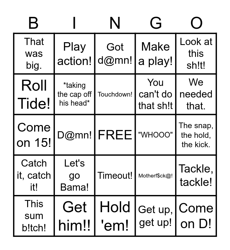 This bingo card has a free space and 29 words: This sum b!tch!, *pacing while clapping*, D@mn!, Throw the ball!, That was big., Got d@mn!, *taking the cap off his head*, Let's go Bama!, "WHOOO", Get him!!, The snap, the hold, the kick., Come on D!, Hold 'em!, Get up, get up!, We needed that., Sh!t, Timeout!, Catch it, catch it!, Look at this sh!t!, Come on 15!, Motherf$ck@!, We killing they @ss!, You can't do that sh!t, Roll Tide!, Make a play!, Play action!, Tackle, tackle!, Touchdown! and First down....
