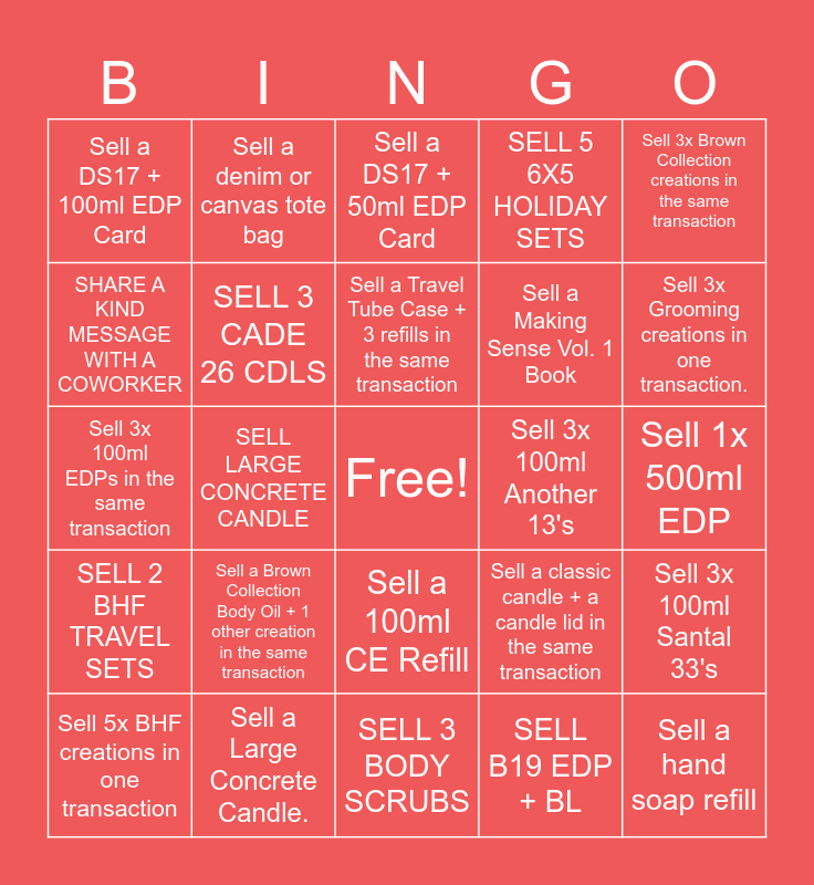 This bingo card has a free space and 24 words: Sell a Brown Collection Body Oil + 1 other creation in the same transaction, Sell a Large Concrete Candle., Sell a Travel Tube Case + 3 refills in the same transaction, Sell 5x BHF creations in one transaction, Sell 3x Brown Collection creations in the same transaction, Sell a DS17 + 100ml EDP Card, SHARE A KIND MESSAGE WITH A COWORKER, Sell a denim or canvas tote bag, Sell 3x 100ml Another 13's, Sell a 100ml CE Refill, Sell a Making Sense Vol. 1 Book, Sell 3x 100ml EDPs in the same transaction, Sell a classic candle + a candle lid in the same transaction, Sell 3x 100ml Santal 33's, SELL 3 CADE 26 CDLS, SELL B19 EDP + BL, Sell 1x 500ml EDP, Sell a DS17 + 50ml EDP Card, Sell 3x Grooming creations in one transaction., SELL LARGE CONCRETE CANDLE, Sell a hand soap refill, SELL 2 BHF TRAVEL SETS, SELL 5 6X5 HOLIDAY SETS and SELL 3 BODY SCRUBS.