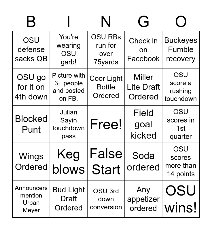 This bingo card has a free space and 24 words: Keg blows, Bud Light Draft Ordered, Coor Light Bottle Ordered, Announcers mention Urban Meyer, Buckeyes Fumble recovery, OSU defense sacks QB, OSU go for it on 4th down, You're wearing OSU garb!, Field goal kicked, False Start, Miller Lite Draft Ordered, Blocked Punt, Soda ordered, OSU scores more than 14 points, Picture with 3+ people and posted on FB., Any appetizer ordered, OSU scores in 1st quarter, OSU RBs run for over 75yards, OSU score a rushing touchdown, Julian Sayin touchdown pass, OSU wins!, Wings Ordered, Check in on Facebook and OSU 3rd down conversion.