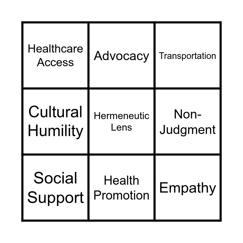 This bingo card has 31 words: Free!, Income, Employment, Education, Healthcare Access, Transportation, Social Support, Culture, Discrimination, Geography, Rural Living, Stress, Financial Strain, Low Education, Job Instability, First-Time Mother, Limited Resources, Intrapersonal, Interpersonal, Contextual, Hermeneutic Lens, Critical Lens, Relational Lens, Advocacy, Empathy, Non-Judgment, Cultural Humility, Safety, Empowerment, Health Promotion and Nursing Standpoint.