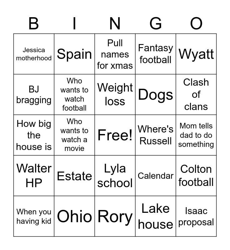 This bingo card has a free space and 24 words: Estate, Ohio, Weight loss, When you having kid, Wyatt, Jessica motherhood, BJ bragging, Spain, Where's Russell, Lyla school, Dogs, How big the house is, Calendar, Colton football, Who wants to watch football, Lake house, Mom tells dad to do something, Pull names for xmas, Clash of clans, Who wants to watch a movie, Isaac proposal, Walter HP, Fantasy football and Rory.