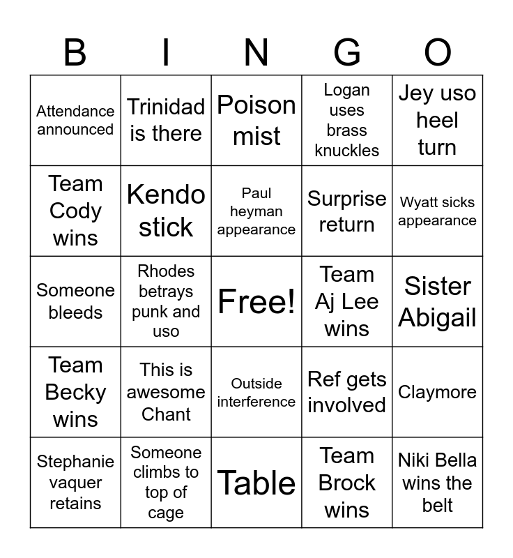 This bingo card has a free space and 24 words: This is awesome Chant, Someone climbs to top of cage, Paul heyman appearance, Stephanie vaquer retains, Jey uso heel turn, Attendance announced, Team Cody wins, Trinidad is there, Team Aj Lee wins, Outside interference, Surprise return, Someone bleeds, Ref gets involved, Claymore, Kendo stick, Team Brock wins, Sister Abigail, Poison mist, Wyatt sicks appearance, Rhodes betrays punk and uso, Niki Bella wins the belt, Team Becky wins, Logan uses brass knuckles and Table.