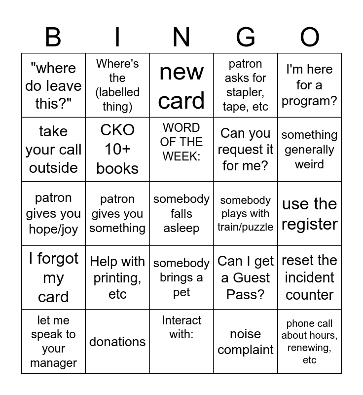 This bingo card has 25 words: Help with printing, etc, Interact with:, WORD OF THE WEEK:, let me speak to your manager, I'm here for a program?, "where do Ieave this?", take your call outside, Where's the (labelled thing), somebody plays with train/puzzle, somebody brings a pet, Can you request it for me?, patron gives you hope/joy, Can I get a Guest Pass?, reset the incident counter, CKO 10+ books, phone call about hours, renewing, etc, use the register, new card, something generally weird, patron gives you something, somebody falls asleep, donations, I forgot my card, patron asks for stapler, tape, etc and noise complaint.