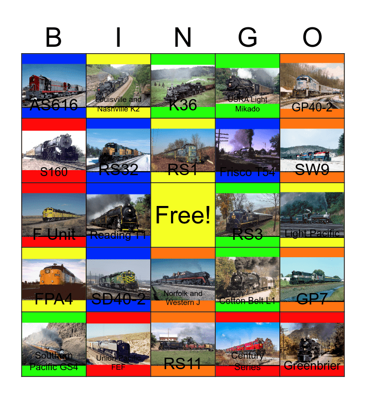 This bingo card has 24 images, a free space and 24 words: SD40-2, Union Pacific FEF, RS1, Southern Pacific GS4, GP40-2, AS616, S160, Louisville and Nashville K2, RS3, Norfolk and Western J, Frisco T54, F Unit, Cotton Belt L1, GP7, RS32, Century Series, Light Pacific, K36, SW9, Reading T1, Greenbrier, FPA4, USRA Light Mikado and RS11.