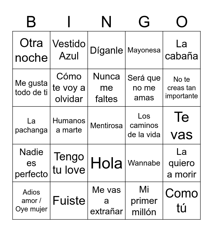 This bingo card has a free space and 29 words: Adios amor / Oye mujer, Loco por volverte a ver, Humanos a marte, Piel morena, Otra noche, Díganle, Cómo te voy a olvidar, Tengo tu love, Los caminos de la vida, Fuiste, Te vas, Como tú, Me vas a extrañar, Mi primer millón, No te creas tan importante, Salomé, Hola, Nadie es perfecto, La cabaña, La pachanga, Wannabe, No me arrepiento de este amor, Será que no me amas, Me gusta todo de ti, Mayonesa, Vestido Azul, La quiero a morir, Nunca me faltes and Amor clasificado.
