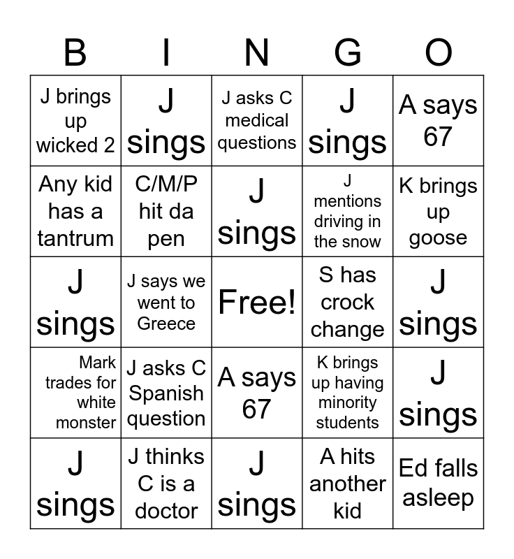 This bingo card has a free space and 29 words: J sings, A crash out, J says we went to Greece, K brings up cowboys documentary, J brings up wicked 2, J asks C medical questions, C/M/P hit da pen, J asks C Spanish question, S has crock change, J thinks C is a doctor, J sings, Ed falls asleep, J sings, A hits another kid, K brings up goose, J mentions driving in the snow, A says 67, Mark trades for white monster, A says 67, J sings, K brings up having minority students, K tells story you’ve heard before, J mentions driving in the snow, Any kid has a tantrum, J sings, J sings, J sings, J sings and J sings.