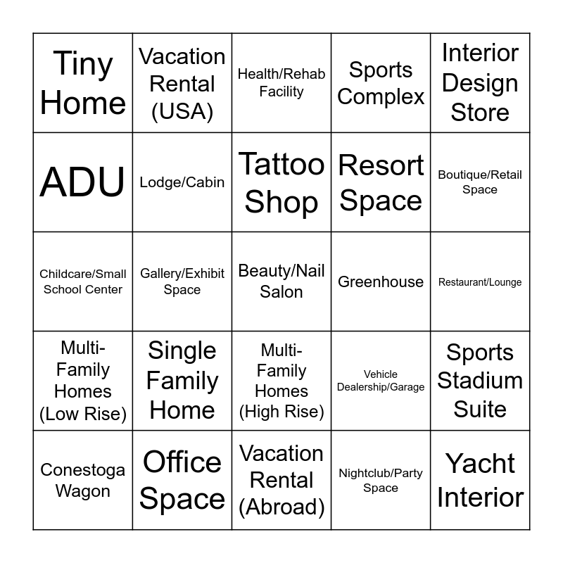 This bingo card has a free space and 24 words: Single Family Home, Office Space, Tattoo Shop, Conestoga Wagon, Interior Design Store, Tiny Home, ADU, Vacation Rental (USA), Greenhouse, Multi-Family Homes (High Rise), Resort Space, Childcare/Small School Center, Vehicle Dealership/Garage, Sports Stadium Suite, Lodge/Cabin, Nightclub/Party Space, Restaurant/Lounge, Health/Rehab Facility, Boutique/Retail Space, Gallery/Exhibit Space, Yacht Interior, Multi-Family Homes (Low Rise), Sports Complex and Vacation Rental (Abroad).