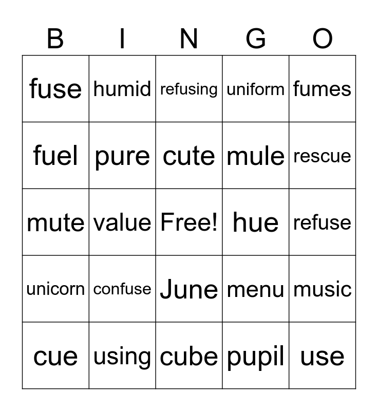 This bingo card has a free space and 25 words: confuse, cube, cute, cue, fumes, fuse, fuel, humid, hue, June, mule, mute, menu, music, pure, pupil, refuse, refusing, rescue, value, use, using, unicorn, uniform and pupil.