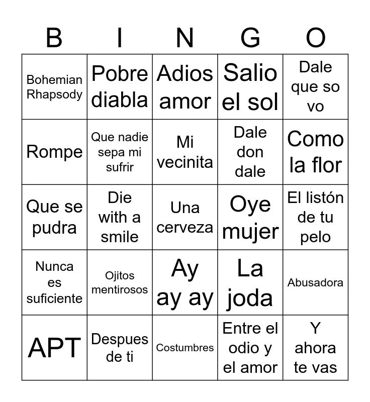 This bingo card has a free space and 29 words: APT, La perla, Die with a smile, Help, Bohemian Rhapsody, Adios amor, Que nadie sepa mi sufrir, Ojitos mentirosos, Oye mujer, Despues de ti, El listón de tu pelo, Y ahora te vas, Costumbres, Entre el odio y el amor, Como la flor, Vamos a bailar, Ay ay ay, Nunca es suficiente, Dale que so vo, Que se pudra, La joda, Perdóname, Dale don dale, Rompe, Salio el sol, Pobre diabla, Abusadora, Mi vecinita and Se preparó.