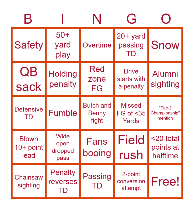 This bingo card has 31 words: Passing TD, Rushing TD, Fumble, Interception, Safety, Overtime, Holding penalty, Field rush, Missed FG of <35 Yards, 2-point conversion attempt, "Pac-2 Championship" mention, Butch and Benny fight, Free!, Shot of drunk fan, Alumni sighting, Non-QB pass TD, <20 total points at halftime, Wide open dropped pass, Blown 10+ point lead, Fans booing, Snow, JaMarcus Shephard mention, Chainsaw sighting, 50+ yard play, Drive starts with a penalty, QB sack, 20+ yard passing TD, Defensive TD, Penalty reverses TD, Red zone FG and Punt.